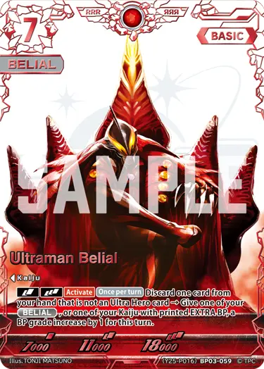 [DBL][TRP][Activate](Once per turn)Discard one card from your hand that is not an Ultra Hero card → Give one of your 『BELIAL』 , or one of your Kaiju with printed EXTRA BP, a BP grade increase by 1 for this turn.