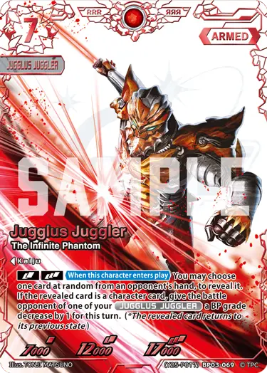 [DBL][TRP]《When this character enters play》You may choose one card at random from an opponent's hand, to reveal it. If the revealed card is a character card, give the battle opponent of one of your 『JUGGLUS JUGGLER』 a BP grade decrease by 1 for this turn. (*The revealed card returns to its previous state)