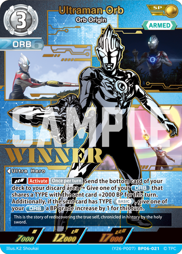 [TRP][Activate](Once per turn)Send the bottom card of your deck to your discard area → Give one of your 『ORB』 that shares a TYPE with the sent card +2000 BP for this turn. Additionally, if the sent card has TYPE 【BASIC】 , give one of your 『ORB』 a BP grade increase by 1 for this turn.