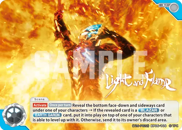 [Activate](Once per turn)Reveal the bottom face-down and sideways card under one of your characters → If the revealed card is a 『BLAZAR』 or 『EARTH GARON』 card, put it into play on top of one of your characters that is able to level up with it. Otherwise, send it to its owner's discard area.