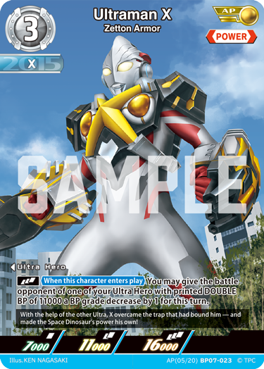 [TRP]《When this character enters play》You may give the battle opponent of one of your Ultra Hero with printed DOUBLE BP of 11000 a BP grade decrease by 1 for this turn.