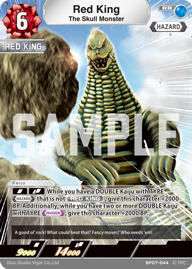 [SIN][DBL]While you have a DOUBLE Kaiju with TYPE 【HAZARD】 that is not 『RED KING』 , give this character +2000 BP. Additionally, while you have two or more DOUBLE Kaiju with TYPE 【INVASION】 , give this character +2000 BP.