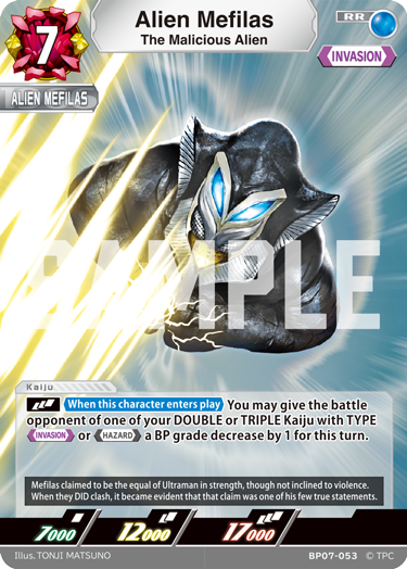 [TRP]《When this character enters play》You may give the battle opponent of one of your DOUBLE or TRIPLE Kaiju with TYPE 【INVASION】 or 【HAZARD】 a BP grade decrease by 1 for this turn.