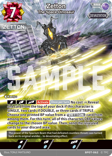 [SIN][DBL][TRP][Activate](Once per turn)No cost → Reveal one card from the top of your deck if this character is SINGLE, two cards if DOUBLE, or three cards if TRIPLE. Choose one printed BP value from a 『ZETTON』 card from among them. For this turn, all of this character's BP values change to the chosen BP value. Then, send the revealed cards to your discard area.