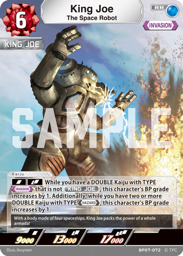 [SIN][DBL]While you have a DOUBLE Kaiju with TYPE 【INVASION】 that is not 『KING JOE』 , this character's BP grade increases by 1. Additionally, while you have two or more DOUBLE Kaiju with TYPE 【HAZARD】 , this character's BP grade increases by 1.