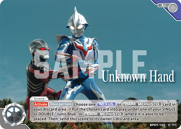 [Activate](Once per turn)Choose one 『NEXUS』 or 『DARK MEPHISTO』 card in your discard area → Put the chosen card into play under one of your SINGLE or DOUBLE 「Junis Blue」 or 『DARK MEPHISTO』 where it is able to be placed. Then, send this scene to its owner's discard area.