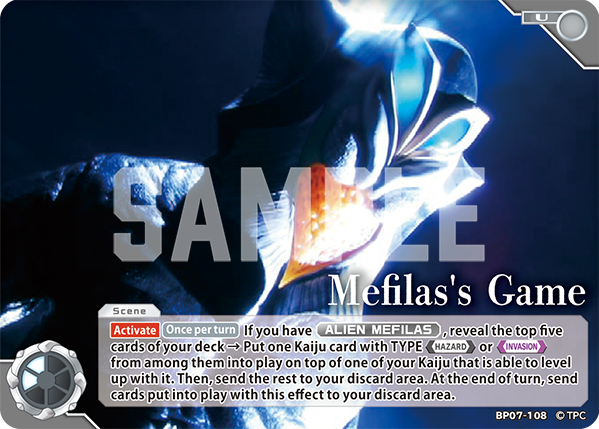 [Activate](Once per turn)If you have 『ALIEN MEFILAS』 , reveal the top five cards of your deck → Put one Kaiju card with TYPE 【HAZARD】 or 【INVASION】 from among them into play on top of one of your Kaiju that is able to level up with it. Then, send the rest to your discard area. At the end of turn, send cards put into play with this effect to your discard area.