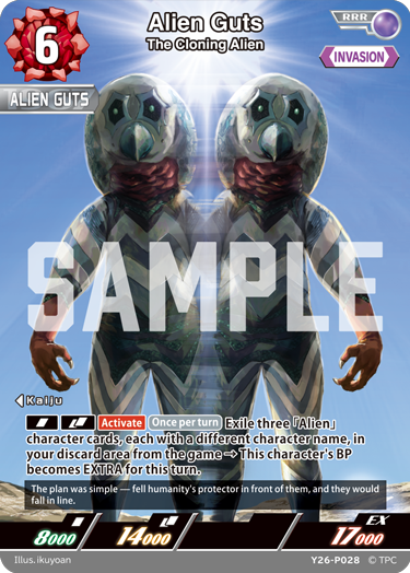 [SIN][DBL][Activate](Once per turn)Exile three 「Alien」 character cards, each with a different character name, in your discard area from the game → This character's BP becomes EXTRA for this turn.
